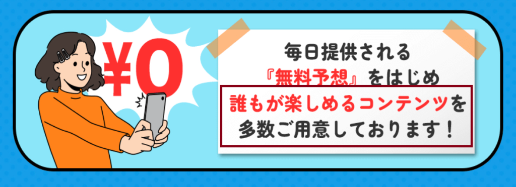 - 毎日提供される「無料予想」をはじめ誰もが楽しめるコンテンツを多数ご用意しております!