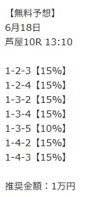 | 6月18日(水) 芦屋10R | 不的中 | -10,000円 |