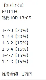 | 6月9日(月) 鳴門12R | 的中 | +11,800円 |